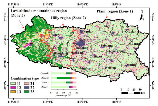 Agricultural land, construction land, and ecological land accounted for about 73.27%, 10.27%, and 16.46% of Handan in 2015, respectively. Handan spans three geomorphic regions from east to west: plain region (Zone 1), hilly region (Zone 2), and low-altitude mountainous region (Zone 3), occupying 62%, 18%, and 20% of Handan, respectively. Agricultural land and construction land were mostly located in Zone 1 and Zone 2. The ecological land (i.e., forest, grassland, shrub land, water bodies, and wetland) is mainly distributed in Zone 2 and Zone 3.