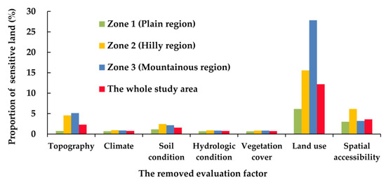 Figure 8 presents the proportion of sensitive land due to the removal of one evaluation factor from the evaluation system. Except for land use, when any other factor was removed from the evaluation system, the proportion of sensitive land was below or near 5% in each geomorphic region. The total proportion of sensitive land accounted for 8.5%, 22.3%, and 33.3% of Zone 1, Zone 2, and Zone 3, respectively. The above findings confirmed that the model and result had relatively strong robustness and stability.