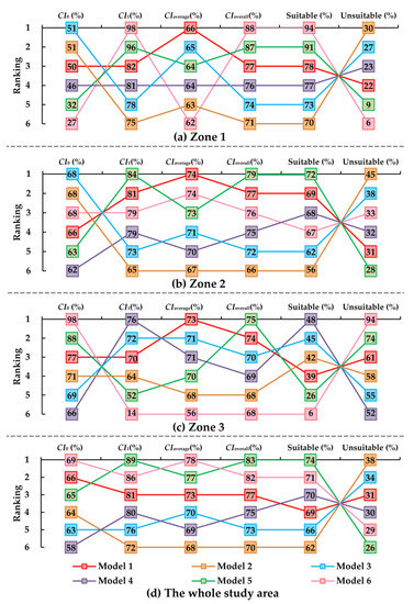Figure 9 shows the rankings of evaluation models in terms of multiple performance metrics. Among the six evaluation models, the optimized model (Model 1) achieved a high ranking in terms of the consistency indexes in every sub-region of Handan. In terms of overall consistency index (CIoverall) and average consistency index (CIaverage), Model 2, Model 3, and Model 4 were ranked behind Model 1 in every sub-region. This demonstrated that the comprehensive consideration of natural factors and socioeconomic factors and the use of MI weights could improve the accuracy of evaluation results.