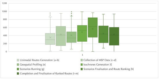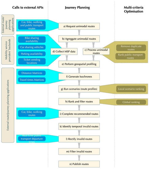 (m) Filter invalid routes: Although filtering of partial or completed routes takes place throughout the processing pipeline (especially in steps g and k), a final filtering procedure removes options that may lack functionality or efficiency when analysed holistically. Let us consider the following example of a route where the origin and destination are in very close proximity (i.e., less than 1000 m of walking distance). An option of a journey using bike-sharing may reach this route generation stage as it may meet all soft and hard constraints applied in previous processing steps. However, this option may include a 400 m walk to reach the bike station closest to the origin (which may bring the user further away from the destination), a 600 m cycling leg to reach the bike station closest to the destination and another 400 m walking leg to reach the destination from there. As it can be understood, the efficiency of this option is significantly lower compared to a single walking leg from origin to destination. A list of rules (applicable to different scenarios) has been embedded in our solution to filter out such dysfunctional options.