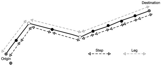 (b) Aggregate unimodal routes: As each API uses different data structures for the representation of the route, this stage involves the transformation of the different API responses to a harmonised data format for further processing. In our system, each route is made up of legs, with each representing movement with a particular mode of transport (Figure 2). Non-fixed routes (i.e., driving, walking, cycling, etc.) are further decomposed in steps for more granular representation of the paths. Fixed routes with stops (i.e., public transport) incorporate information about the stops included in the services. In addition to legs constituting movement between locations, action legs included in the routes symbolise activities that users undertake during a modal shift. Examples include dropping off a shared car at a particular location, collection of a ticket before boarding a public transport vehicle and others.