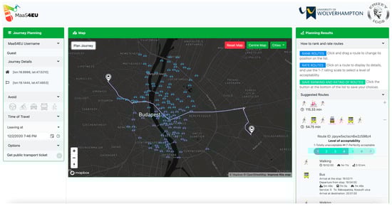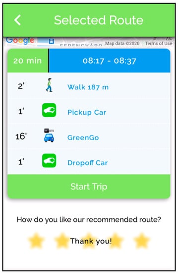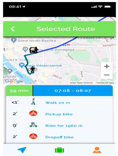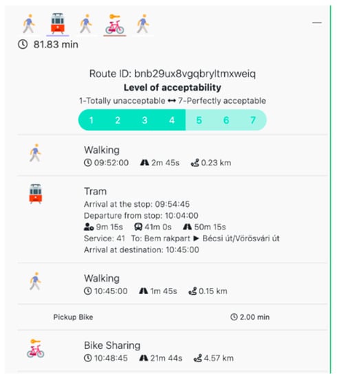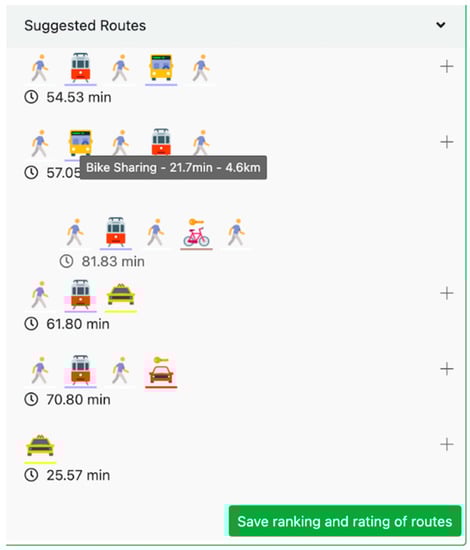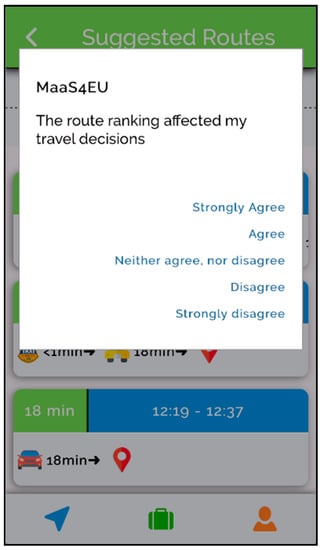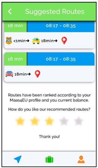 The system and context view, which refers to a computational process that leads to the identification of the current context of the user and a user model that infers preferences through the analysis of past behaviour including user trips and selections of routes in a MaaS app. The ranking of the routes according to the optimal MaaS plan usage utility is done by rearranging the list generated through the personal utility. More specifically, the position of the routes that are mainly performed with a transport mode with an increased usage trend in the MaaS plan (the respective context variables are “Increased car sharing usage trend”; “Increased bike sharing usage trend”, etc.) is rearranged, so that the respective routes are placed at the bottom of the ranked list with the aim to facilitate optimal usage of the purchased MaaS plan. Similarly, in the ranked list created by considering the mode promotion utility, the routes that are mainly performed with a transportation mode (e.g., bike sharing, public transport, etc.) or a mobility service provider (e.g., a specific bike sharing provider) that the MaaS operator wants to promote, are placed at the top of the ranked list. Finally, the environmental friendliness utility is calculated by estimating the CO2 emissions of each route based on a simple linear model that has been tested in real life conditions [62]. The model takes as input the distance covered with a specific means of transportation and a set of emission coefficients per transportation mode as follows: Subway—40 g/km; train—60 g/km; Bus—50 g/km; Car—100 g/km. Note that past research has shown that exact and accurate emission values do not provide additional value when considered by end-users [63] which means that an estimate of emissions’ related information is enough for our case. The routes are ranked on an ascending order in terms of emissions, so that the most environmentally friendly routes are ranked first. In all cases, ties are broken by considering the travel time.