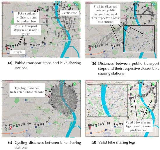 - Lines 10–14, derive the valid bike-sharing legs based on constraints set by user preferences. These include the walking distance from the alighting public transport stop to the bike station and the cycling distance of the leg (Figure 5d).