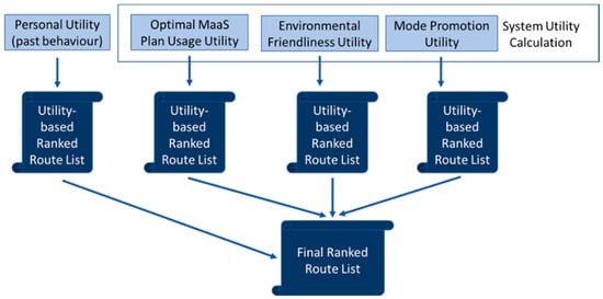 The Route Utility calculation function comprises of several sub-functions (Figure 8). In more details the sub-functions provide different views of how the routes should be ordered and presented to the users, which are eventually consolidated in a single ranked list of routes that are communicated to users through the MaaS app. The sub-functions fall under two main views of how the routes should be ordered, the personal and the system view.