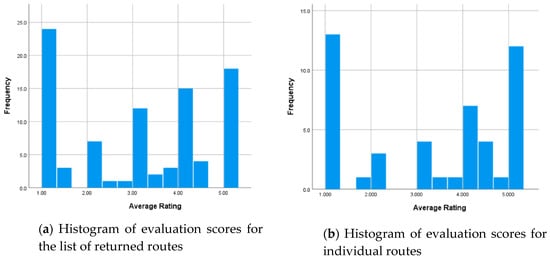 - Lines 20–26, rank the constructed partial routes using a set of criteria with scores and weights based on empirical investigations with experts participating in the MaaS4EU project. This was achieved by a preliminary evaluation round using the web application shown in Figure 3. Experts were asked in their professional capacity to rate the level of acceptability of each route (Figure 6) and rank the presented routes in the order of preference (Figure 7). For this particular scenario, the details for the application of TOPSIS can be seen in Table 3.