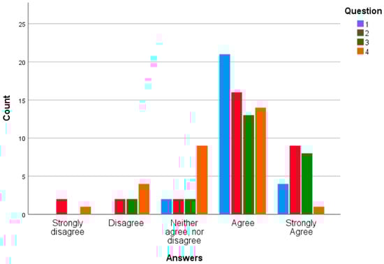 As it can be seen the majority of the answers were for the Agree, or Strongly Agree option and the following averages were recorded; Q1: 4.07, Q2: 3.9, Q3: 4.08, Q4: 3.34.