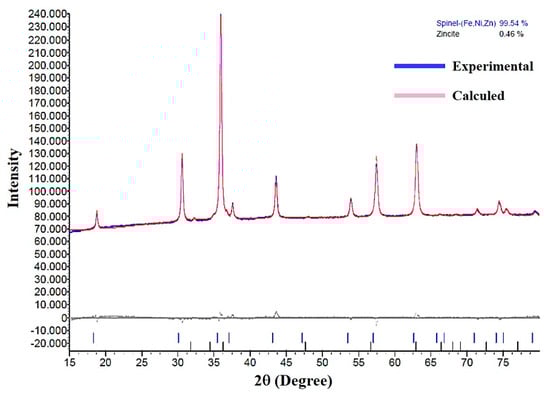 The network parameters and percentage quantities of the phases in the ZnO-Ni0.5Zn0.5Fe2O4 catalyst (800 °C) are shown in Table 2. It was observed that the calculated value of the lattice parameter was 8.38 Å, which is close to the theoretical (8.3827 Å; JCPDS card 52-0278) and experimental values (8.35 Å; [43]) already reported. Additionally, it was possible to observe the maintenance of the unit cell with cubic symmetry, suggesting that there was no structural change due to the high proportion of Ni-Zn ferrite. Regarding phase quantification, the presence of the Ni-Zn ferrite phase in high quantity (99.54%) and segregated ZnO phases (0.46%) were identified in the ZnO-Ni0.5Zn0.5Fe2O4 catalyst that was heat-treated at 800 °C, which is in agreement with the XRD results (see Figure 1).