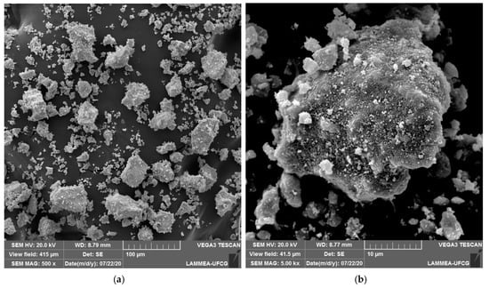 Figure 4 shows the SEM images acquired from the ZnO-Ni0.5Zn0.5Fe2O4 catalyst that was heat-treated at 800 °C. It was observed that the ZnO-Ni0.5Zn0.5Fe2O4 catalyst presented irregular agglomerates (Figure 4a) with pores in its surface. Clusters (Figure 4a) and particles (Figure 4b) were observed in the SEM images, with sizes close to 100 and 10 μm, respectively. The diffusion of small particles occurred with the consequent agglomeration of them on the large particles’ surface. This indicates that the heat treatment caused the diffusion of small particles and, consequently, caused the growth of the agglomerates, corroborating with the results of the specific surface area presented in the textural analysis.
