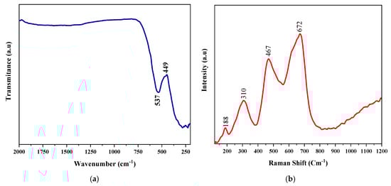 Figure 6a,b shows the FTIR and Raman spectrums measured from the ZnO-Ni0.5Zn0.5Fe2O4 catalyst, heat-treated at 800 °C. Figure 6a shows bands below 1000 cm−1, characteristic of ferrites with a spinel-like crystalline structure [51]. Bands at 537 and 449 cm−1 were also observed and are attributed to the tetrahedral and octahedral forms of ZnO-Ni0.5Zn0.5Fe2O4, which is in agreement with the XRD experiments (see Figure 1). As shown in the literature [52], the vibrational frequency around 600–500 cm−1 is related to the Fe3+ O2− complex at the tetrahedral site. On the other hand, the vibrational frequency around 450–350 cm−1 is related to the Fe3+ O2− and M2+ O2− complexes (where M2+ = Zn2+, Mn2+, Fe2+) at the octahedral site.