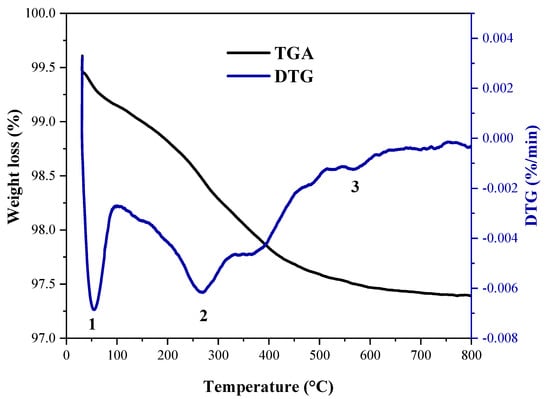 Thermogravimetric analysis (TG/DTG) was performed using Perkin Elmer STA 6000 TG-DTA equipment in an N2 atmosphere, with the flow of 20 mL·min−1 and heating rate of 10 °C·min−1, using 10 mg of sample in an alumina crucible, and a temperature range from 30 to 850 °C [30,36,37,38].