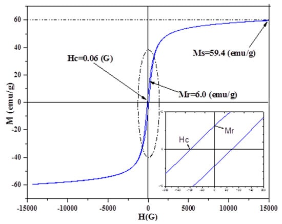 The magnetic behavior of the ZnO-Ni0.5Zn0.5Fe2O4 catalyst, heat-treated at 800 °C, was evaluated from the magnetization (M) versus magnetic field (H) curve (see Figure 8). Due to the low values of remaining magnetization (6.0 my/g) and coercivity (0.06 (G)), it is possible to see that the ZnO-Ni0.5Zn0.5Fe2O4 catalyst presents a soft magnetic behavior (i.e., easily magnetizes and demagnetizes. The hysteresis curve presents a well-defined S shape and a very narrow internal area, suggesting the catalyst studied has ferrimagnetic behavior [55]. The maximum saturation magnetization was 59.4 emu/g, higher than the values already reported in the literature [12]. The heat treatment applied to synthesize the ZnO-Ni0.5Zn0.5Fe2O4 catalyst favored a considerable increase in saturation magnetization.