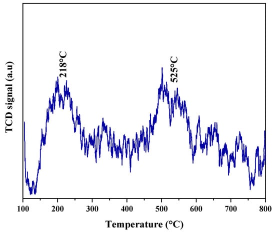 The active acid sites of the ZnO-Ni0.5Zn0.5Fe2O4 catalyst (800 °C) were determined using TPD-NH3 analysis (see Figure 9). It is possible to see two NH3 desorption peaks in the TPD-NH3 analysis, where the first peak (~218 °C, corresponding to weak and moderate acidic sites) and the second peak (~525 °C) are attributed to acidic sites of a strong nature. These results are in agreement with the literature [56,57].