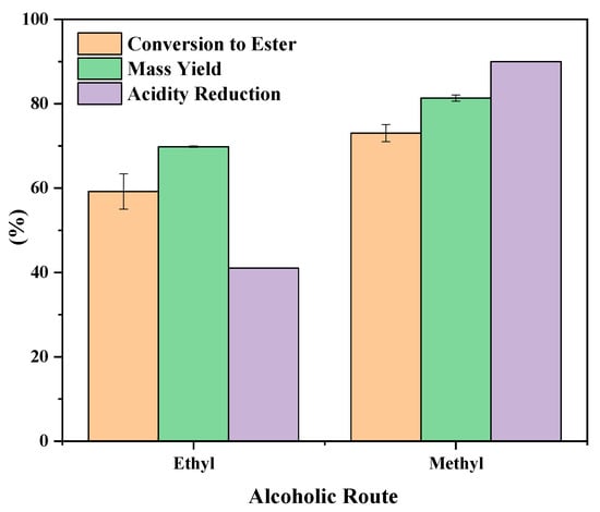 Figure 10 shows the catalytic performance, acidity reduction, and mass yield of the ZnO-Ni0.5Zn0.5Fe2O4 catalyst in TES reactions of the residual oil, performed in the presence of ethanol and methanol. At this moment, the dependent variable is the alcoholic route, with the following reaction conditions fixed—alcohol/oil ratio of 1/15, residual oil mass of 30 g, the reaction time of 1 h, temperature 200 °C, and 3% catalyst percentage (0.9 g). The ester conversion was 73%, and the mass yield was around 80% for the methyl alcoholic route. The ethyl route showed lower conversions, with 59.1% for the ester conversion and mass yield in approximately 70%. The acidity of the FAAEs produced reduced significantly when using the methyl alcoholic route (reaching ~90%), while the ethyl route reached −41%, suggesting that a large part of the available raw material reacted to the test conditions.