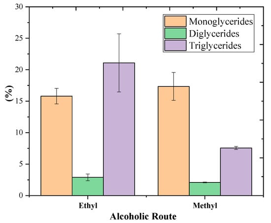 In the TES reactions tested, there was a difference of approximately 14.29% in the conversion values in favor of methanol. Such behavior is probably due to the physical and chemical nature (short-chain and polarity) of methanol, leading to higher conversions than alcohol. Therefore, the type of alcohol used can be one factor for the disparity in the conversions resulting from the transesterification and esterification reactions since the other parameters involved in the processes, such as temperature and time, were kept unchanged [59]. Methanol is frequently used to obtain short-chains and polar, and the fact that it is free of water makes it easier to separate esters and glycerin, culminating in greater conversions. Thus, it is possible that the water present in ethanol interfered, for example, in the TES reaction by ethyl route, reducing the final reaction product (fatty acid ethyl esters). Consequently, it provided the formation of an emulsion in the mixture of esters due to the formation of insoluble fatty acids during the reaction process.