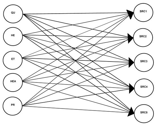 Proposed structural model that relates VP and SRC. VP includes quality (QU), hedonism (HE), ethics (ET), health (HEA) and price (PR), while SRC includes behavior of the company (SRC1), products related to a cause (SRC2), small businesses (SRC3), geographical origin (SRC4) and volume of consumption (SRC5). Source: Own processing, 2017.