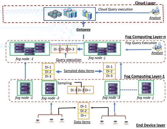 Figure 1 shows that the sensors emit data items ( to ), which are ingested by the . These data items travel from to through distinct paths. In each path, data items get sampled by those fog nodes which are selected as optimal by the proposed algorithm. After sampling, the sampled data items arrive at for query execution. The query results are sent back to the user display after performing query execution.