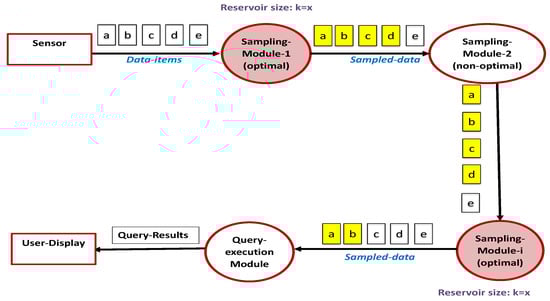 The application model of Fossel consists of two types of modulesβsampling module and query execution module. Sampling modules are placed on all fog nodes from to and the query execution module is placed on . In each path, the sampling modules of optimal fog nodes perform the reservoir sampling on the streaming data and forwards the sampled data items to the query execution module. Figure 2 shows the system modules of Fossel application model. Figure 2 modules represent the flow of processing tasks performed in analyzing the streaming data according to the proposed approach scenario. In Figure 2, shaded modules (sampling module-1 and βiβ ) represent the modules of optimal fog nodes. As can be seen in the Figure 2, the sampling module-1 ingests data items from the sensor, then it samples the data items according to the set reservoir size (k = x) and forwards the sampled data items to the next module (sampling-module-2). Here variable βxβ represents the size of the reservoir βkβ. The sampling module-2 (non-optimal) forwards the sampled data items to the next sampling module (module-i) in the path. The sampling module-i again performs the reservoir sampling on the sampled data items forwarded by the lower node module of path. Finally, the sampling module-i forwards the sampled data items to the query execution module. After the query processing, the query results are sent back to the user display.