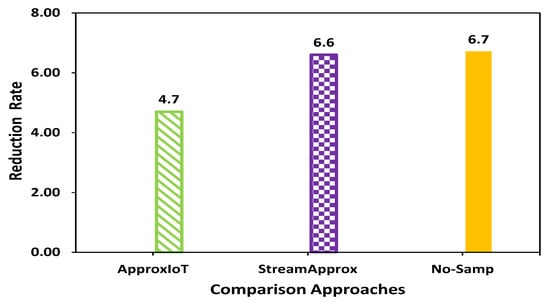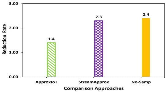 However, the ApproxIoT approach utilizes edge nodes for sampling; but it performs query execution on the cloud node. Due to this reason, sampled data items need to transmit to the cloud node for query execution. This results in longer network delays as query results have to pass through the Wide Area Network (WAN) links before reaching the user dashboard. StreamApprox approach incurs higher latency as compared to Fossel because it performs both sampling and query execution on the cloud node. Sampling is performed just one time before query execution. Due to this reason, its querying data size is large as compared to proposed Fossel, which leads to increased query computation time. The No-samp approach incurs the highest latency among all techniques because it does not sample the data streams. It performs the query execution on the cloud node on all data items instead of on the sampled data, leading to increased query computation time and network delays. Figure 4 shows the Fossel approachβs latency reduction rate compared to the other three approaches. The Fossel approach reduces latency by 4.7, 6.6 and 6.7 times as compared to ApproxIoT, StreamApprox and No-samp approaches, respectively.