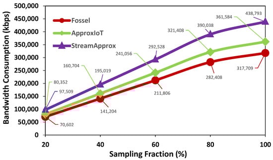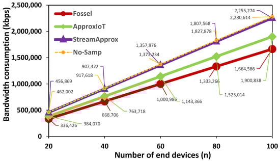 Figure 6 shows the impact of the number of end devices on the bandwidth consumption. The bandwidth consumption increases with the increase in the number of data-producing devices. Fossel reduces the transmission data size and performs the query execution within the fog, which results in a higher bandwidth saving rate as compared to the other approaches. As opposed to this, the ApproxIoT approach transmits sampled data items to the cloud node for query execution utilizing all βNβ link capacity from the fog to the cloud node. On the other hand, in StreamApprox and No-samp approaches, all data items are transmitted to the cloud node for query execution, which results in more bandwidth consumption compared to Fossel. Figure 7 shows the Fossel approachβs bandwidth saving rate compared to other approaches. The Fossel approach reduces the bandwidth consumption by 1.1, 1.3 and 1.4 times as compared to ApproxIoT, StreamApprox and No-samp approaches, respectively.