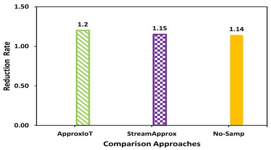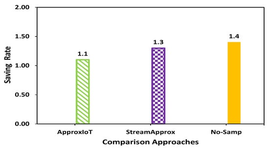 On the other hand, in the case of the StreamApprox and No-samp approaches, the querying data size is large. They utilize more computational power than our Fossel approach. Moreover, in ApproxIoT, StreamApprox and No-samp approaches, gateway power is consumed in transmitting the sampled or unsampled data items to the cloud node. Figure 11 shows the Fossel approachβs energy consumption reduction rate compared to the other approaches. The Fossel approach saves energy consumption by 1.20, 1.15 and 1.14 times as compared to ApproxIoT, StreamApprox and No-samp approaches, respectively.