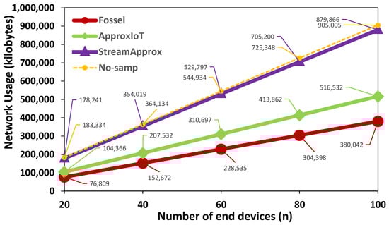 Network Usage:Figure 8 displays the network usage evaluation results of proposed Fossel approach. In this experiment, we varied the number of end devices from 20 to 100 while fixing values of two other parameters (sampling fraction and window size) as 20% and 2 s, respectively. Figure 8 shows that Fossel significantly reduces the network usage compared to the ApproxIoT, StreamApprox and No-samp approaches. The main reason for less network usage in Fossel is that it reduces the transmission data size and also performs the query execution within the fog. By doing so, there is no need to transmit data items to the cloud. Total network usage depends on the number of links utilized and on the data traffic. Fossel utilizes fewer network links compared to ApproxIoT, StreamApprox and No-samp approaches. The ApproxIoT approach transmits the sampled data items to the cloud node for query execution. It utilizes all βNβ links from fog to the cloud node, resulting in excessive network usage. However, in the case of StreamApprox and No-samp approaches, the increased network usage is because all streaming data items are transmitted to the cloud node resulting in excessive utilization of all local and WAN links. Figure 9 shows the Fossel approachβs network usage reduction rate in comparison with the other techniques. The Fossel approach reduces the network usage by 1.4, 2.3 and 2.4 times compared to ApproxIoT, StreamApprox and No-samp approaches, respectively.