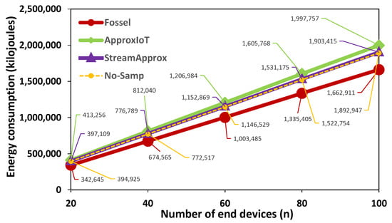 Energy Consumption:Figure 10 demonstrates the evaluation results of proposed Fossel approach in terms of energy consumption. In this evaluation, we varied the number of end devices from 20 to 100 while keeping the other two parameters constant. Energy consumption is measured as the total sum of energy consumed by all types of devices doing operations (fog nodes, gateway and cloud node). Figure 10 shows that Fossel performs better that others in terms of the energy consumption. Energy consumption is directly related to the number of devices doing operations and computational power utilization in data processing. Fossel incurs less energy consumption because it performs computations on reduced data size and utilizes fewer fog nodes for the sampling operation. As compared to this, ApproxIoT consumes more energy because it utilizes all edge nodes to perform sampling plus weight calculation operation.