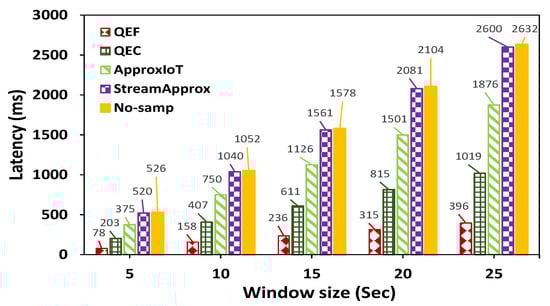In this section, we demonstrate the efficiency of our approach in terms of the query execution on fog and the query execution on cloud. QEF denotes the query execution within the fog, according to the proposed approach scenario. QEC means the query execution on the cloud; in that case, we implemented the proposed approach in a way that it performs query execution on the cloud instead of fog. We performed this evaluation to model such scenarios where the query is too heavy to execute within the fog. Figure 12 represents the latency comparison of QEF and QEC with other related approaches. For this evaluation, the parameter window size is varied from 5 to 25 s, by fixing the sampling fraction parameter and the number of end devices to be 20% and 4, respectively.