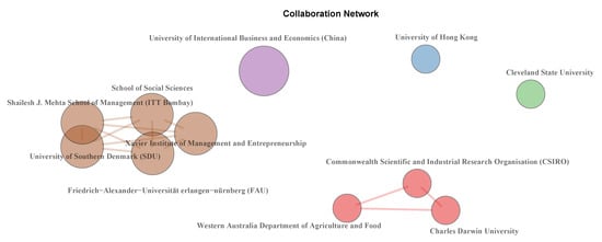 We also visualized the most relevant networks of universities and research centers present in the 424 documents analyzed, as shown in Figure 2. We have identified the top five groups of research, where we can distinguish two groups and three individual universities.The individual universities include The University of International Business and Economics from China, which is the biggest node, followed by the University of Hong Kong and Cleveland State University. In the two groups, it is possible to differentiate between the red centers, which represents three research centers from Australia, and the brown centers that come from Malaysia, India (2), Denmark and Germany. The latter is highly interconnected, but in general, the conclusion is that there is a scarcity of connections between the different networks.