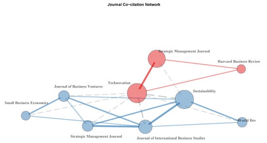 Focusing attention on the source journals we found that three journals concentrate most of the documents; Sustainability, Technovation and Strategic Management Journal. Figure 3 shows these journals jointly with the strength of co-citation connections among them. The scope of these journal is clearly consistent with the aim of JV, where innovation and strategic management inspire most of the JV initiatives.