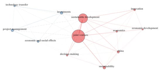 However, although the research topic is relatively new, Figure 4 shows the keyword co-occurrence of the 12 keywords with a minimum number of seven occurrences. The most recurring keywords are represented in larger nodes (sustainability and JV). The thicker the link between the different nodes, the stronger the relationship between the keywords. The program identified two clusters or groups of words related to each other (nodes of the same color belong to the same cluster). The blue color represents co-occurrences related with China, sustainability and decision making. The red cluster shows a strong relation between JV and sustainable development. The two clusters are highly connected, especially the nodes of China and JV (in blue) and with less strength with project management or innovation (in red). It should be noted that technology transfer showed the smallest amount of co-occurrences.