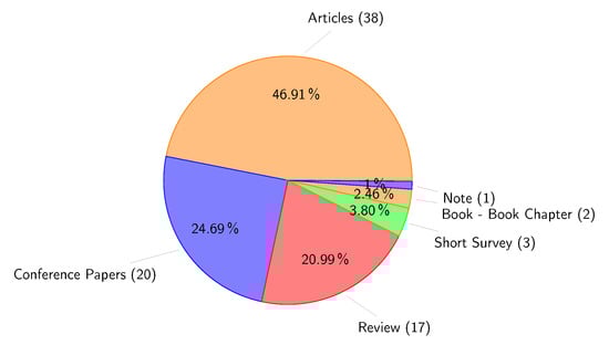 Focusing on those documents that simultaneously contain both terms, the set of documents was greatly reduced to 424 studies. Table 1 shows the breakdown according to the type of document. Among these, about 50% were journal articles and 20% were conference papers, which can be considered as documents more closely linked to research activity. It is also worthwhile to mention that 47 documents (about 10%) were review papers.