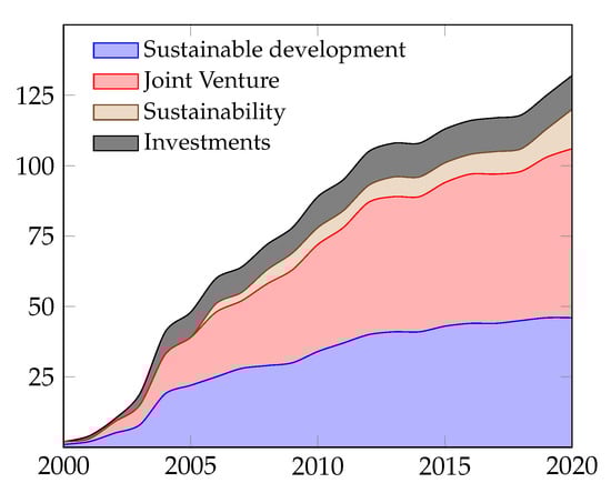 Focusing on the keywords, the most relevant in the literature are: sustainable development, joint venture, sustainability and investments. Figure 7 presents these most relevant keywords in chronological cumulative appearance.