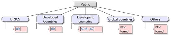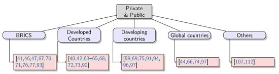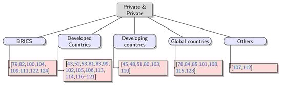 Taking into consideration the characteristics presented in the previous sections, cross-sectional data will be shown in a graphic way. For each type of JV identified, a figure will show how many publications were found for each host country group. According to the results, apparently Figure 8 and Figure 9 do not show a clear branch of knowledge for scholars’ interests. On the contrary, the biggest interest is shown for private and public (Figure 10) and private and private (Figure 11). As can be seen, the most productive host countries in terms of research interest are BRICS and developed countries.