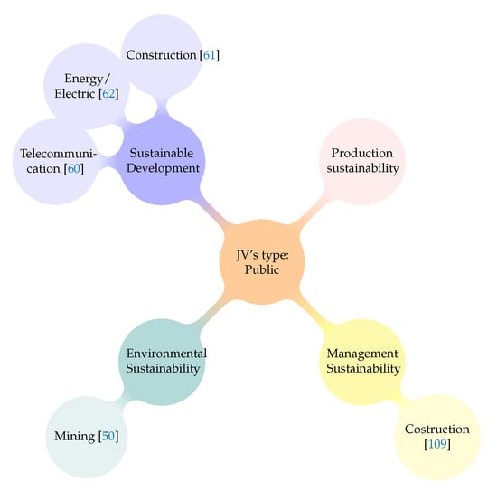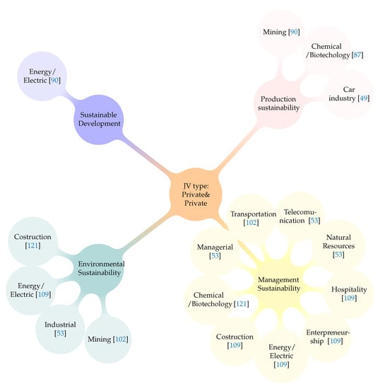 - Private and Public: The JV is created between corporations and/or States. In these JVs there is a potential active role of the State. Clear examples are articles related with cities [,] and construction [,] development and sustainability. For example the development of an eco-city in China [], house planing in Oxford [] or the acoustic technology of Oman’s airport []. The role of technological transference is clear in these JV as in the cases of water [], oil [], forest [] and paper machinery [] and engineering in the Three Gorges Project [] among others. There is also a notable component of learning processes [,,,] and corporate structure [,,].