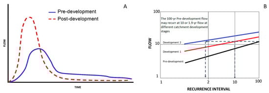 Effect of urban development on stormwater flow (A) and return frequency (B). With increasing urbanization, the recurrence interval of a 100-year flood can be reduced by one or more orders of magnitude, increasing the probability of risk to life and property.