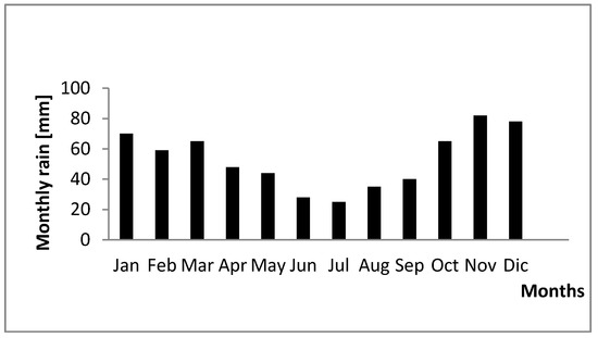 The design of the retention system is based on the estimate of the amount of rainwater and snowmelt on site: for small-scale solutions (e.g., single-family housing, service construction, single public facility building) as in the described case this does not require complex dynamic flow calculations, unlike the case of large catchments [45]. The site’s 20-year average annual precipitation (rainwater plus snowmelt), obtained from records of a nearby meteorological station, was estimated at about 600 mm (Figure 3). In the last two years, values of 812 mm and 544 mm were observed, respectively.