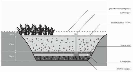 The installation of the garden started with the excavation of a trench with a depth of about 1 m, with a bottom filled with two 10 cm layer of gravel aggregates (8–16 mm and 2–8 mm size) over which a perforated drainage pipe (diameter 90 mm), enveloped in coconut braid cloth, was laid. A vertical overflow pipe (also 90 mm in diameter) installed into the drainage pipe and protruding about 10 cm over the decorative surface gravel of the garden, allows rapid infiltration in case of high intensity events. The horizontal drainage pipe is covered by a 30 cm layer of fine gravel aggregate. The space between the drainage layer and the surface (45 cm) is filled with a mix of coarse sand, brick ore and dolomite aggregate. (Figure 6). The drainage pipe is connected to the public storm water drainage system to avoid overflow and local flooding in case of extreme events. The rain garden top layer consists of a 15–20 cm thick decorative gravel and stonecrop (Sedum spp.) vegetation, with a 2% slope from sides to center. Stonecrop is a succulent perennial plant ideal for dry areas, with easy maintenance and low culture requirements. The chosen plants are Jade and Echeveria.