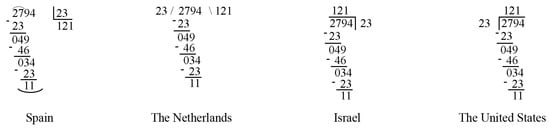 Digit-based strategies, unlike number-based ones, operate on single digits in a procedural way usually from left to right [41]. These strategies comprise the traditional algorithm, where the subtractions of a multiple of the divisor must be optimal [3]. Notation for this strategy varies cross-culturally; the Spanish notation, for instance, is similar to the French, but differs from the Israeli, Dutch, and American forms (Figure 1).