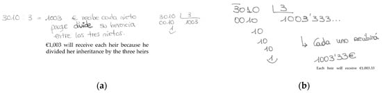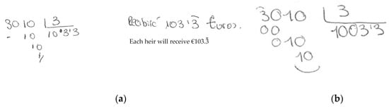 About a quarter of the pre-service teachers properly computed the algorithm and partially interpreted the mathematical solution in relation to the context of the problem. Two types of responses were identified in this way: one using only integer numbers, the other using decimal numbers. In the first case, the participants gave the solution by operating integers, as shown in Figure 4a (subject 4, woman, aged 23). According to the interviews, these teachers were conscious that when managing euros, you can use two decimal digits, but they lacked confidence to calculate this decimal part. Subject 4, for example, expressed: “I didn’t calculate the decimal part, because I was never good at operating with decimal numbers.” In contrast to those above, other subjects operated with decimals, arriving at a recurring number in the quotient (Figure 4b, subject 72, woman, aged 19), and rounding it off to the nearest hundredths (i.e., € 1003.33). In both cases, with and without the use of decimals, the pre-service teachers made a partial interpretation of the mathematical solution. They suggested that the heirs would receive either € 1003 or € 1003.33, but they did not interpret the leftover amount (€ 1 or 1 c, respectively), leaving the reader to infer by him/herself the precise solution in the context of the problem. The cognitive interviews revealed that most subjects did not make any judgment involving the remainder, despite tackling a familiar financial context. The majority declared that, when solving one-step problems, they focus more on the arithmetic operations than on the outcome interpretation.