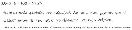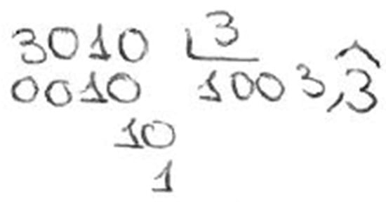“Decomposition” was the second most commonly employed strategy (19.2%). Most of the subjects who used this strategy did not provide a contextual solution, though they presented a correct mathematical model and attained a precise mental computation. All subjects employing the decomposition strategy applied it through a mental process: and 10 ÷ 3 = 3.. As with the traditional algorithm strategy, many pre-service teachers (65.0%) reported an infinite decimal number as the solution, while others indicated a finite decimal number. The ones reporting a finite number did not give a contextual solution; nobody explained that it is not possible to equally divide € 3010 or that 1 c would always be left over. Subject 48 (man, aged 25) correctly expressed the mathematical model () and the mental computation 1003.3333… (Figure 5). However, he suggested that the three heirs would obtain an amount of money with infinite decimals, when this is unfeasible in the problem context. Subject 48 did not consider the remainder, not even after being asked to explain his solution process. He simply confirmed the written information.