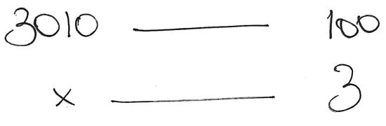 In the decomposition strategy, called “splitting and adding” or “partitioning” by [11,42], respectively, the dividend is decimally split [41]. In direct divisions, the dividend is split into smaller numbers and partial results are added; for example, the division = 19 is computed as follows: so, . In indirect multiplications, separate multiplications of the divisor are added until reaching the dividend: , so, .