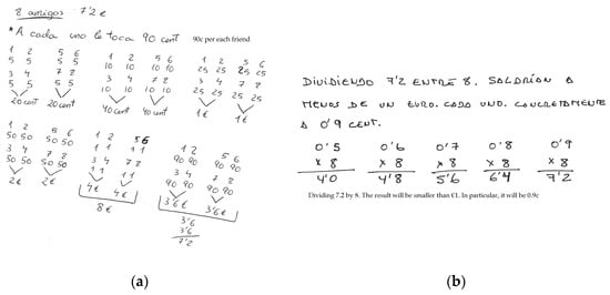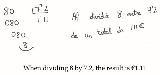 Fifteen per cent of the future teachers who attempted to employ the traditional algorithm provided a correct model (7.2 ÷ 8) and left the operation in blank. They admitted to have forgotten how to solve divisions with decimals because of the frequent use of calculators at school. Subject 49 (man, aged 22) stated: “I don’t know how to solve this division without a calculator.” Others confessed to having forgotten the multiplication tables. During her cognitive interview, subject 30 (woman, aged 24) specified: “without a calculator I can’t even tell multiplication tables. I just completely forgot the multiplication tables of some numbers.” Of the subjects who tried to compute the algorithm, 27.3% did not attain the correct solution. The most common error was in the execution of arithmetic operations, including subtraction and multiplication, as shown by subject 27 and 46 in Figure 8a,b respectively. Subject 27 (woman, aged 21) obtained 6 after subtracting 10−2. The cognitive interview showed this was a random error due to the fact that subjects do not usually need to work out elementary operations. In fact, subject 27 admitted feeling very embarrassed during the test because of her low level in calculus. Similarly, subject 46 (man, aged 41) wrote . He recognized to have forgotten the multiplication tables: “Really, I don’t remember the multiplication tables very well because I don’t use them anymore. I wasn’t sure whether is equal to 72 or 63.”