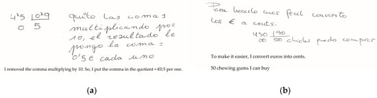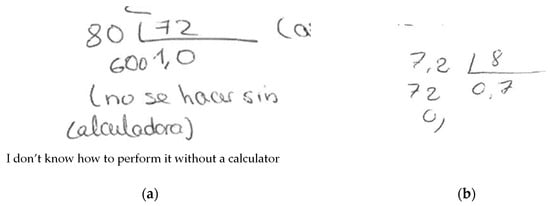 (a) Dividing integers—partial interpretation of the solution (subject 4, woman, aged 23) and (b) dividing with decimals—partial interpretation of the solution (subject 72, woman, aged 19).