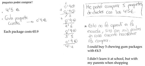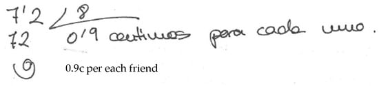 About a quarter (26.3%) of the subjects computed the traditional algorithm correctly, but did not interpret the solution adequately. They incorrectly reported the currency units, indicating that each friend will receive 0.9 c rather than € 0.9, as shown in Figure 9 (subject 19, woman, aged 25). This suggested that subjects establish a connection between decimal numbers, with zero in the integer part, and cents. In this case, they considered that 0.9 could be expressed in cents rather than euros. The cognitive interviews showed that subjects established a contextual relation between the verbal and written representations of the European currency units. In Spain, we normally refer to “ninety cents” rather than to “zero point nine euros” when verbalizing 0.90. Therefore, when using currency amounts lower than one, we frequently verbalize “cents” rather than “euros”; for example, 90 c. Similarly, we speak of euros when the entire part is distinct from zero; for example, € 1.90.