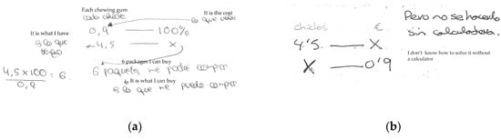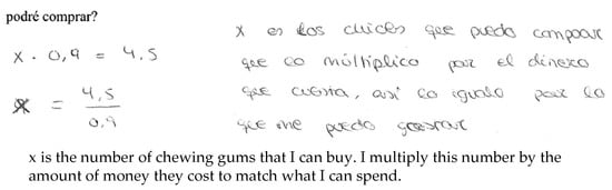 Algebraic strategies were used by 37.5% of the sample: 29.8% attempted to employ the proportion formula, and 7.7% formulated a linear equation. The proportion formula was a recurring strategy in this problem; all subjects recognized feeling confident with this method as they systematically applied it at school to approach different problems. Sixty per cent of them, however, could not use this strategy to provide an adequate model to approach the problem. Figure 13a,b shows some of the difficulties the subjects faced when establishing the relation between magnitudes. Both subject 6 (woman, aged 23) and subject 73 (woman, aged 20) encountered difficulties associating € 0.9 with the unit of chewing gum, as shown in Figure 13a,b respectively. Subject 73 had also problems finding the equality of ratios; this shows she does not grasp the proportion concept.