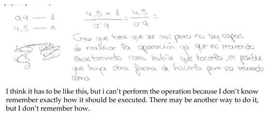 Some subjects provided the correct expression to find the unknown value; however, they did not know how to operate divisions. As shown in Figure 14, subject 56 (woman, aged 20) applied correctly the proportion formula, but she still could not work out the division. She explained: “I think it has to be like this, but I can’t perform the operation because I don’t remember exactly how it should be executed. There may be another way to do it, but I don’t remember how.”