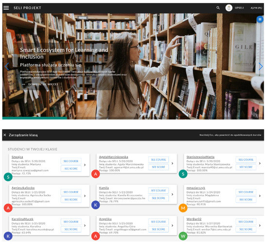 The SELI platform is an international implementation-research project by several countries from Latin America, Europe, and the Caribbean. Its goal is to create a new, visually attractive, intuitive website to support learning and teaching at the academic level [40,41], as well as teacher training for active teachers [42]. Designed from scratch, the platform addresses different levels of the digital divide [43] by creating a friendly learning and teaching environment within formal, non-formal, and informal education. The platform has an interface that enables the website to be used by people with visual and hearing impairments [44,45,46]. The tool was created in cooperation with a team of IT specialists, teachers, pedagogues, and special education teachers [47]. The platform uses relatively new solutions based on digital storytelling, blockchain, and problem-based learning [48]. It is available in a number of languages: English, Spanish, Portuguese, Turkish, and Polish. This study involves a test of the platform by Polish students using the Polish interface. The server used in the tests was located in Europe to ensure the stable functioning of the learning environment (The University of Eastern Finland, Joensuu, Finland). In the first part, students and teachers were invited to explore one of the two e-learning courses available on the SELI platform—Smart Ecosystem for Learning and Inclusion [49].
