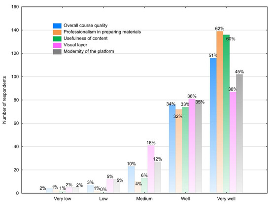 - General evaluation of how the e-learning platform functioned, with a focus on the following elements: course quality, professionalism of the resources, usefulness of the content, graphic design, and modern character of the platform. Feedback was collected using the 5-degree Likert scale, where 1 is very poor and 5 is very good. The survey is an original tool with the following psychometric features:
