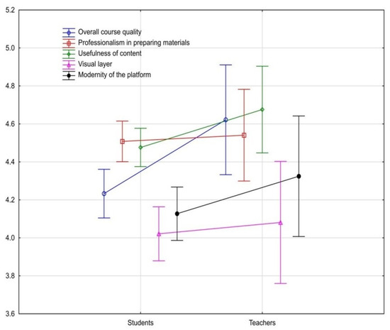 There are differences between the areas evaluated by students and teachers. The teachers evaluated the general aspects of the course more highly: F(1, 224) = 5.8716, p = 0.01618. Other factors such as content usefulness, innovative character, professionalism of the materials, and the visual aspects of the platform were all rated similarly. The differences are presented in Figure 4. Both groups provided very similar answers.