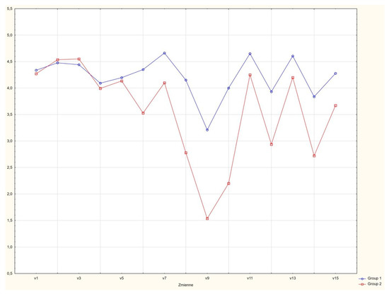 Using cluster analysis, two groups of respondents were identified. The first consisted of 86 persons (37.88%). This group evaluated the new platform in a similar way as group 2. However, the difference is seen mainly in the e-learning experiences of the respondents and their slightly higher evaluation of their own digital literacy. This group has quite strong potential connected with the implementation of teaching innovations and awareness of e-threats. The other group (the red cluster), composed of 140 individuals (62.12%), were respondents with less experience in e-learning, and who at the same time evaluated their digital literacy as being lower. This was two thirds of the sample: the persons who will be or are teachers. This group requires special training support during their pedagogical studies. The statistical differences between the groups are presented in Table 6 and Figure 5.